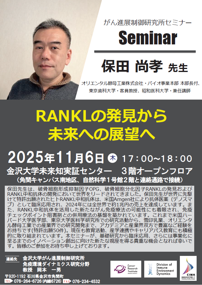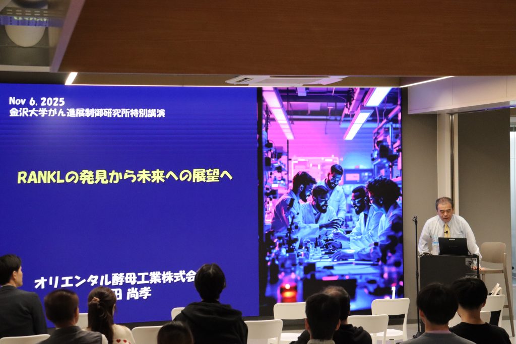 11月6日(木)、がん進展制御研究所セミナーが、学際領域展開ハブ形成プログラム「健康寿命科学」の共催のもと、未来知実証センター3階オープンフロアにおいて開催されました。保田尚孝先生(オリエンタル酵母工業株式会社・バイオ事業本部 本部長付、東京歯科大学・客員教授、昭和医科大学・兼任講師)をお招きし、「RANKLの発見から未来への展望へ」と題したご講演を行っていただきました。