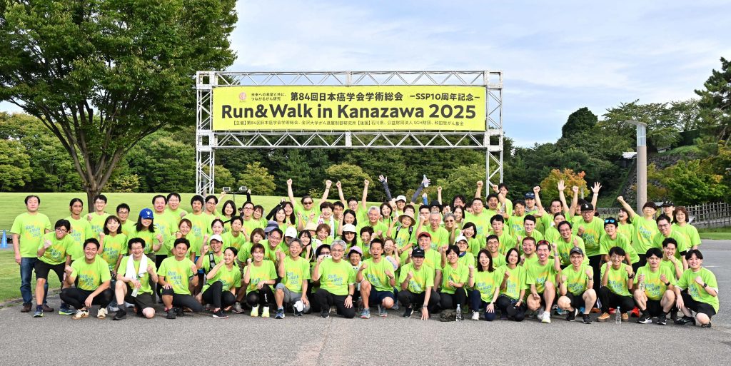 9月24日(水)、金沢城公園・新丸広場で、“Run & Walk in Kanazawa 2025”を開催しました。このイベントは、秋空の下、金沢城公園内の特設コース3kmをがん研究者とがん患者さんおよびご家族の皆様が一緒に楽しく健康的に走る(歩く)ことで、お互いの理解を深めることを目的としております。100名以上が参加し、お揃いのライトグリーンTシャツを着て、3kmのコースを駆け抜けたり、会話を楽しみながら歩いたりと、和やかな交流の時間となりました。