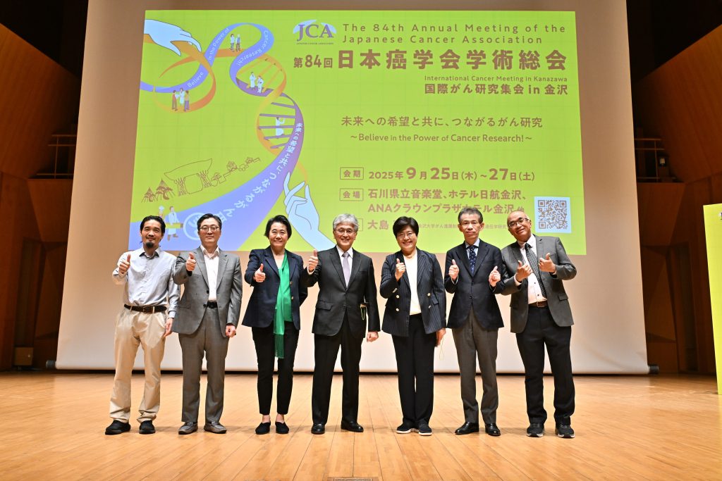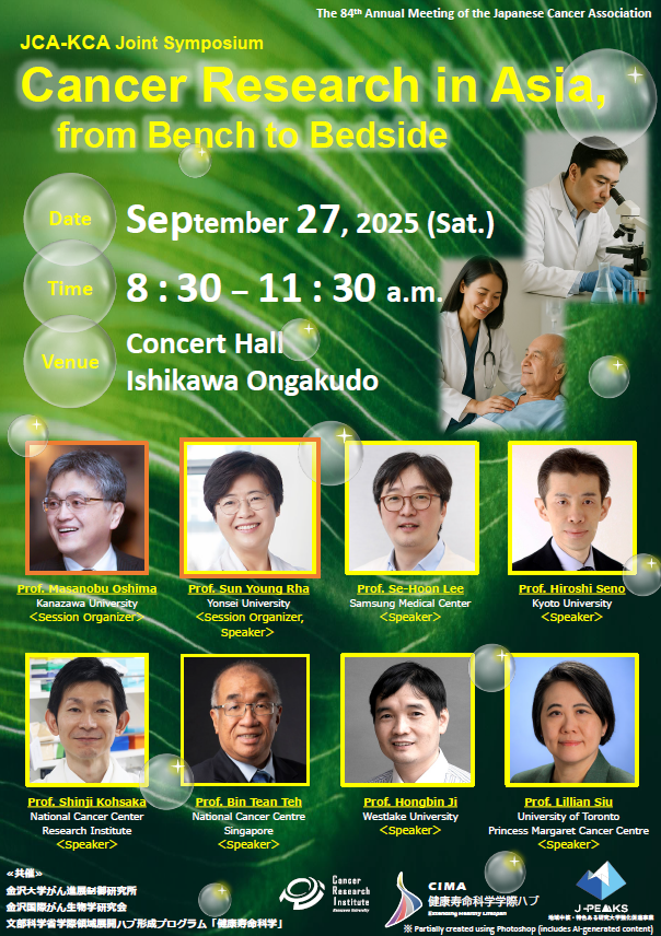 2025年9月27日(土)に、第84回日本癌学会学術総会において、日本癌学会(JCA)と韓国癌学会(KCA)のジョイントシンポジウム「Cancer Research in Asia, from Bench to Bedside」が石川県立音楽堂にて開催されました。共同座長のKCA代表、Sun Young Rha先生と協議し、日韓のがん研究交流を土台に、アジア全体の研究者ネットワーク構築につながる場となるよう、日本・韓国・中国・シンガポール・米国を代表する研究者7名による、基礎から臨床まで幅広いがん研究成果を共有するプログラムを企画しました。本シンポジウムは、金沢大学がん進展制御研究所が主体となる「金沢国際がん生物研究会」および「文部科学省学際領域展開ハブ形成プログラム」との共催として開催し、金沢大学医学系研究科の博士課程大学院生も講義の一環として参加しました。発表では、アジア各国における、胆管がん、胃がん、膵臓がん、肺がんに対する基礎および創薬研究や、臨床試験成績の最新動向が報告され、重要な知見をタイムリーに共有できました。とくに韓国からは、近年アジアで課題となっている”非喫煙者の肺がん”について、疫学・ゲノム解析のアップデートが紹介され、活発な質疑が交わされました。このシンポジウムをきっかけに、日韓、そしてアジアのがん研究者の交流の輪がさらに広がっていくことを期待しています。