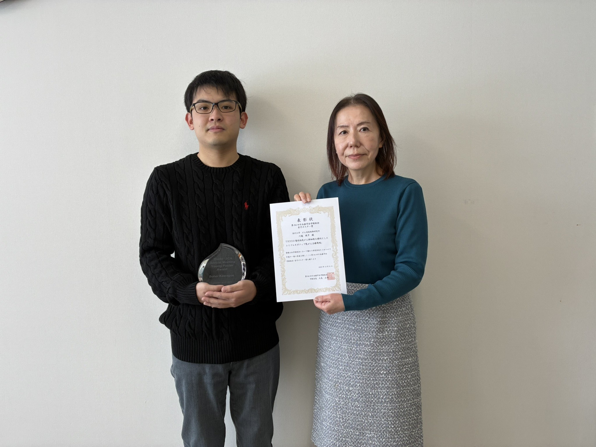 分子病態研究分野・修士課程二年生の川越爽平さんが、第84回日本癌学会学術総会(2025年9月25日~27日、金沢) において、JCA若手研究者ポスター賞を受賞しました。