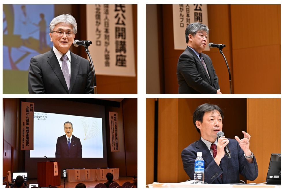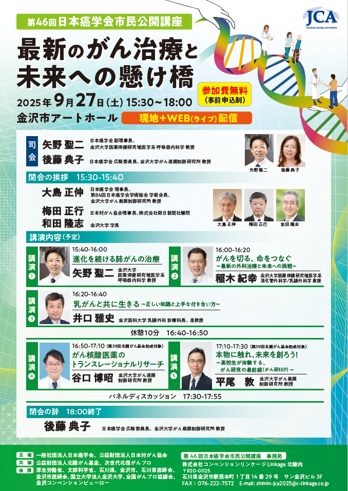2025年9月27日(土)、第46回日本癌学会市民公開講座(ハイブリッド形式)が金沢市アートホールにて開催されました。今回は「最新のがん治療と未来への懸け橋」をテーマに実施され、会場には約100名、オンラインでも約100名の参加がありました。開会にあたり、大島正伸先生(日本癌学会理事長、第84回日本癌学会学術総会会長、金沢大学がん進展制御研究所教授)、梅田正行様(日本対がん協会理事長、株式会社朝日新聞社顧問)、和田隆志先生(金沢大学学長)よりご挨拶をいただきました。続いて、後藤典子先生(日本癌学会広報委員長、金沢大学がん進展制御研究所教授)と矢野聖二先生の司会進行のもと、以下の5名の先生方にご講演いただきました。